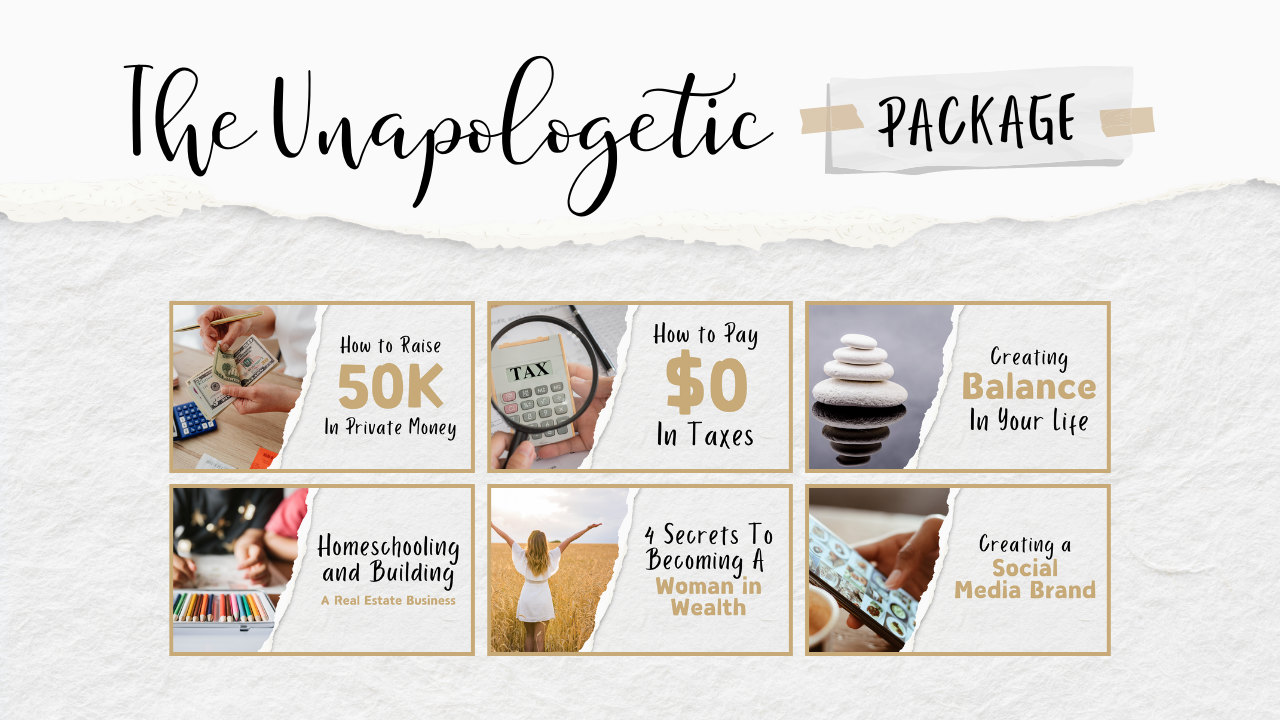 Watch six of my best trainings for FREE including: How to raise your first $50k, creating balance as an entrepreneurial woman, and how to pay $0 in taxes